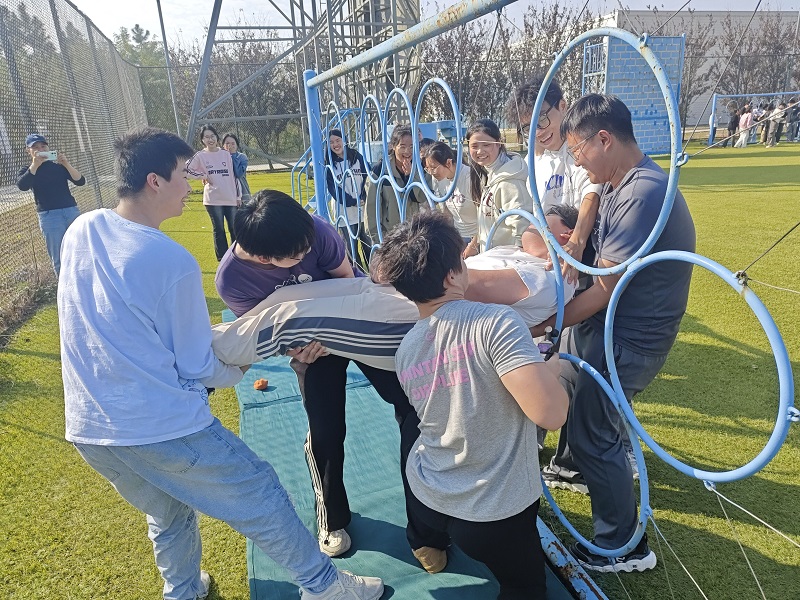 活动开始前,尹双妹做了动员讲话和活动背景介绍,使同学们对此次活动产生了浓厚的兴趣,为活动的顺利进行奠定了良好的基础。在周启航老师的精心组织下,同学们通过“破冰行动”项目拉开了活动的序幕,组建了各自的团队,并迅速融入了欢乐的活动氛围中。进化论项目中,周启航向同学们分享了成功的多重性,引导学生正确看待成败得失,不以一时失败而气馁。团队项目“穿越电网”,模拟了战争时期一支盟军小分队历经千辛逃出集中营的场景,项目难度虽然较大,但同学们切实感受到了团队协作的重要性,也让同学们明白了在失败中进行变通,在试错中慢慢前行。最具挑战项目“空中断桥”,是对挑战者自信心、勇气的考验,也是培养团队凝聚力、激励意识的拓展项目,高空断桥上设置了诸多障碍,亦如人生路上的挑战,鼓起勇气穿越断桥犹如跨过人生道路上的磨砺与考验,该项目让同学们体验到打破传统思维,敢于大胆尝试,创新是解决问题的高效方法